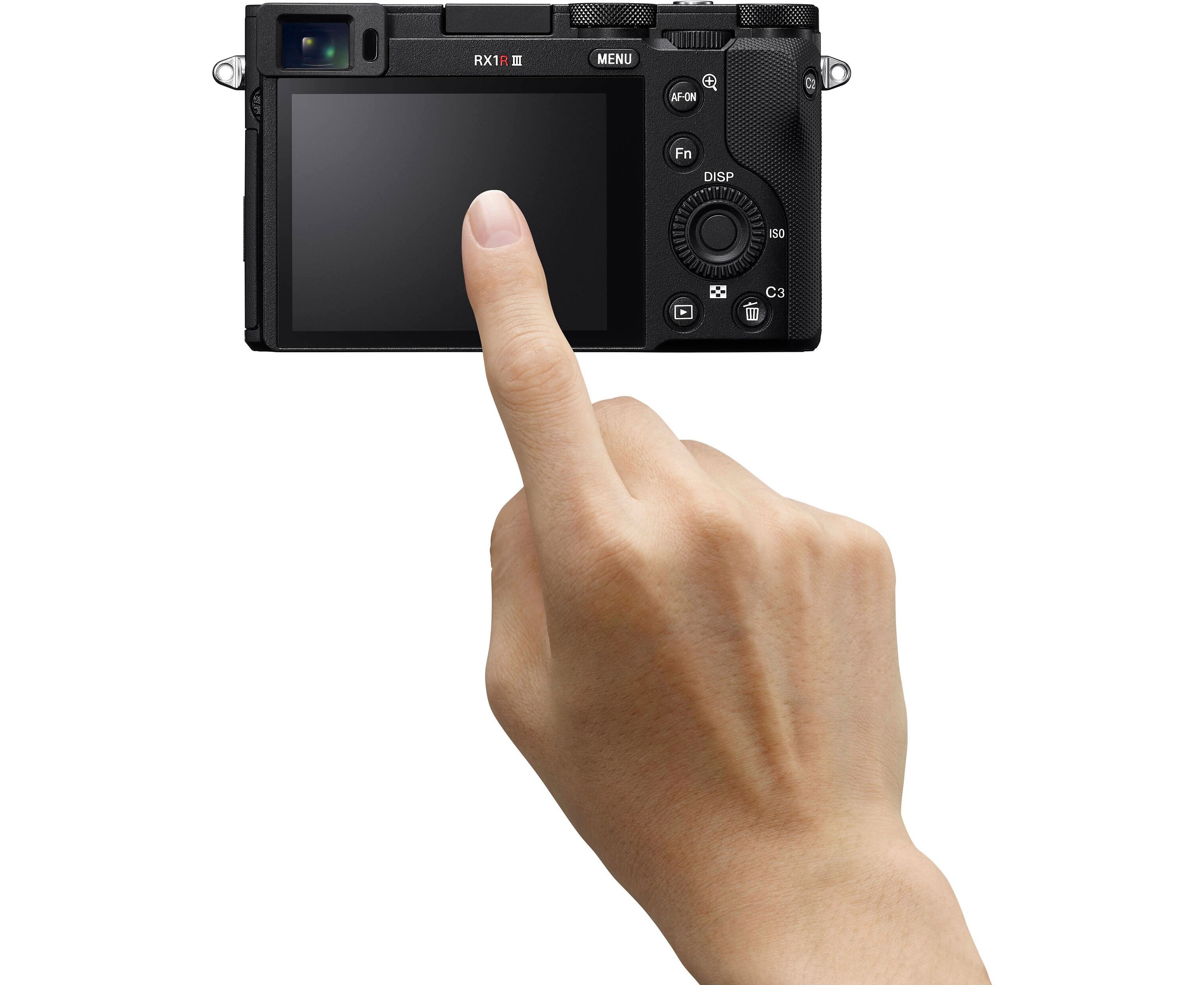 O amplo painel LCD sensível ao toque tipo 3.0 com aproximadamente 2,36 milhões de pontos usado na RX1R III inclui o modo "Sunny Weather" para melhor visibilidade em condições de muita luz, além de permitir o ajuste manual para se adaptar a qualquer iluminação ambiente. A operação do menu tátil é fluida e responsiva. Quando a câmera está no modo de espera, deslizar para cima no painel do monitor revela o menu de funções (Fn) para acesso rápido.