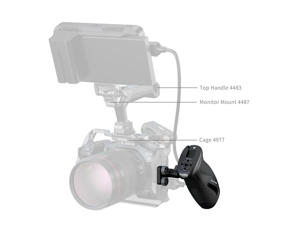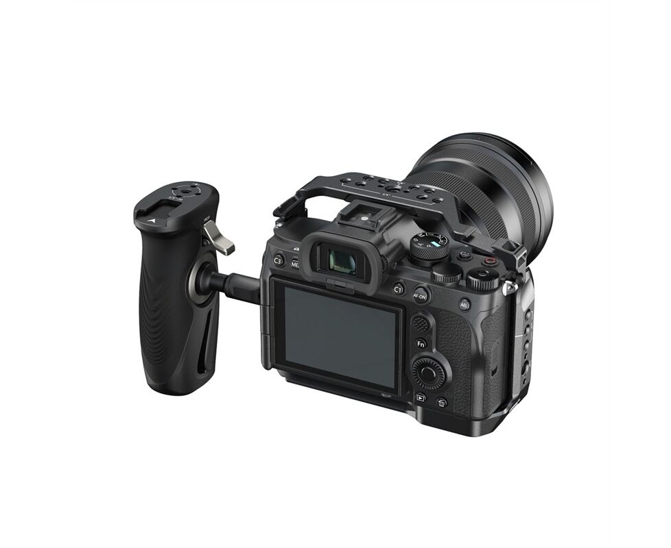 Este punho lateral possui uma rotação de 360° com um toque para ajustes suaves do ângulo durante a filmagem. Oferece opções de expansão versáteis através de múltiplas interfaces de montagem, incluindo orifícios de 1/4"-20 para controlos remotos e braços mágicos, bem como uma sapata fria para acessórios como suportes para monitores, microfones, luzes de vídeo e o DJI Mic 2.